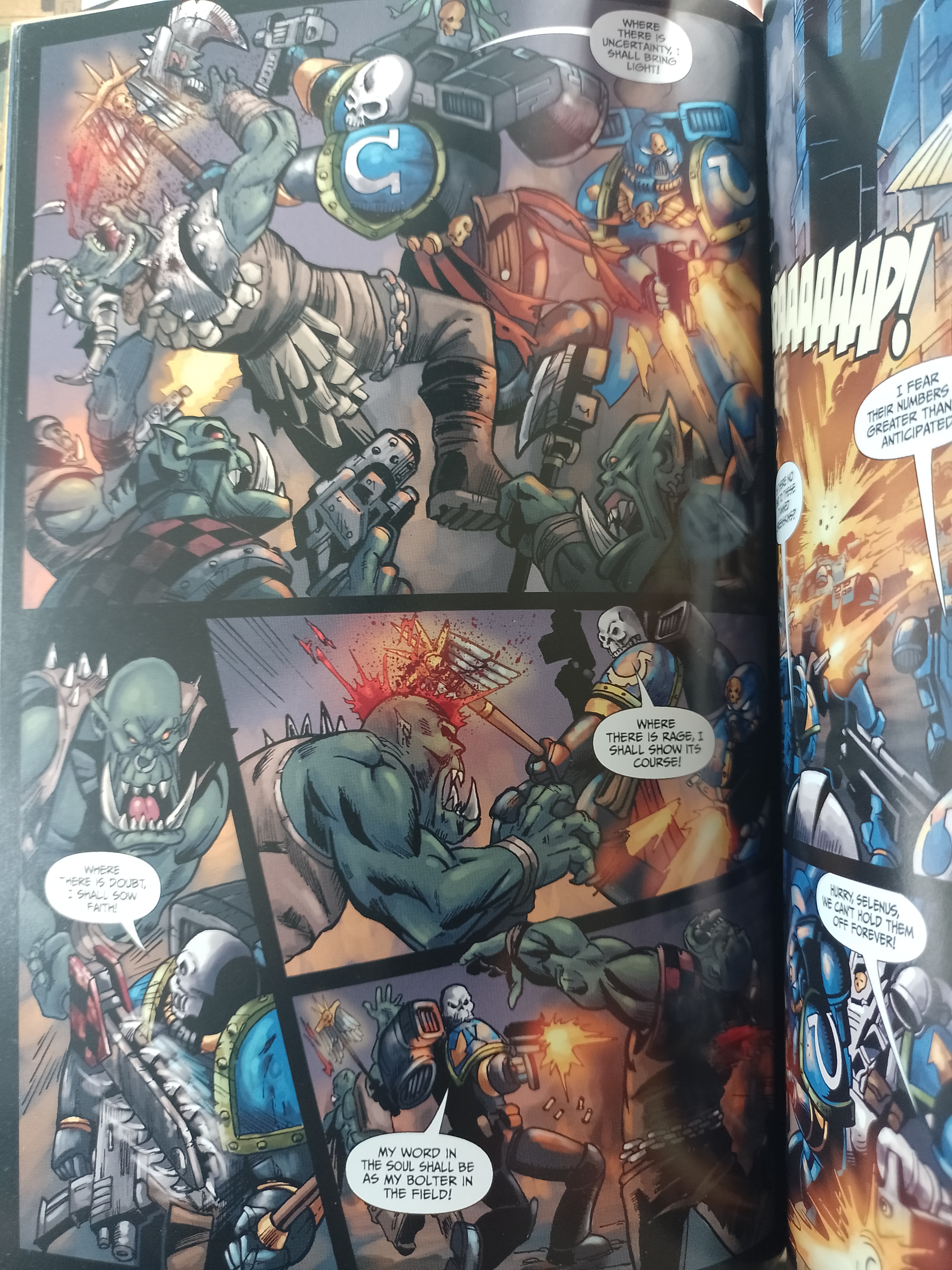 Par contre là où le bât blesse c’est au niveau des dessins, ce qui est dommage pour un comics vous en conviendrez. Ils ne sont pas ignobles loin de là mais je reproche une manque d’attention pour les visages (c’est pour ça qu’il ne faut jamais enlever son casque à un space marine !). Des visage trop lisses, sans détails, peu inspiré voire complètement ratés. J’ai eu mal à mon Marneus Calgar tellement je l’ai trouvé mal fait, sur certaines cases ça va mais sur d’autres c’est une catastrophe.